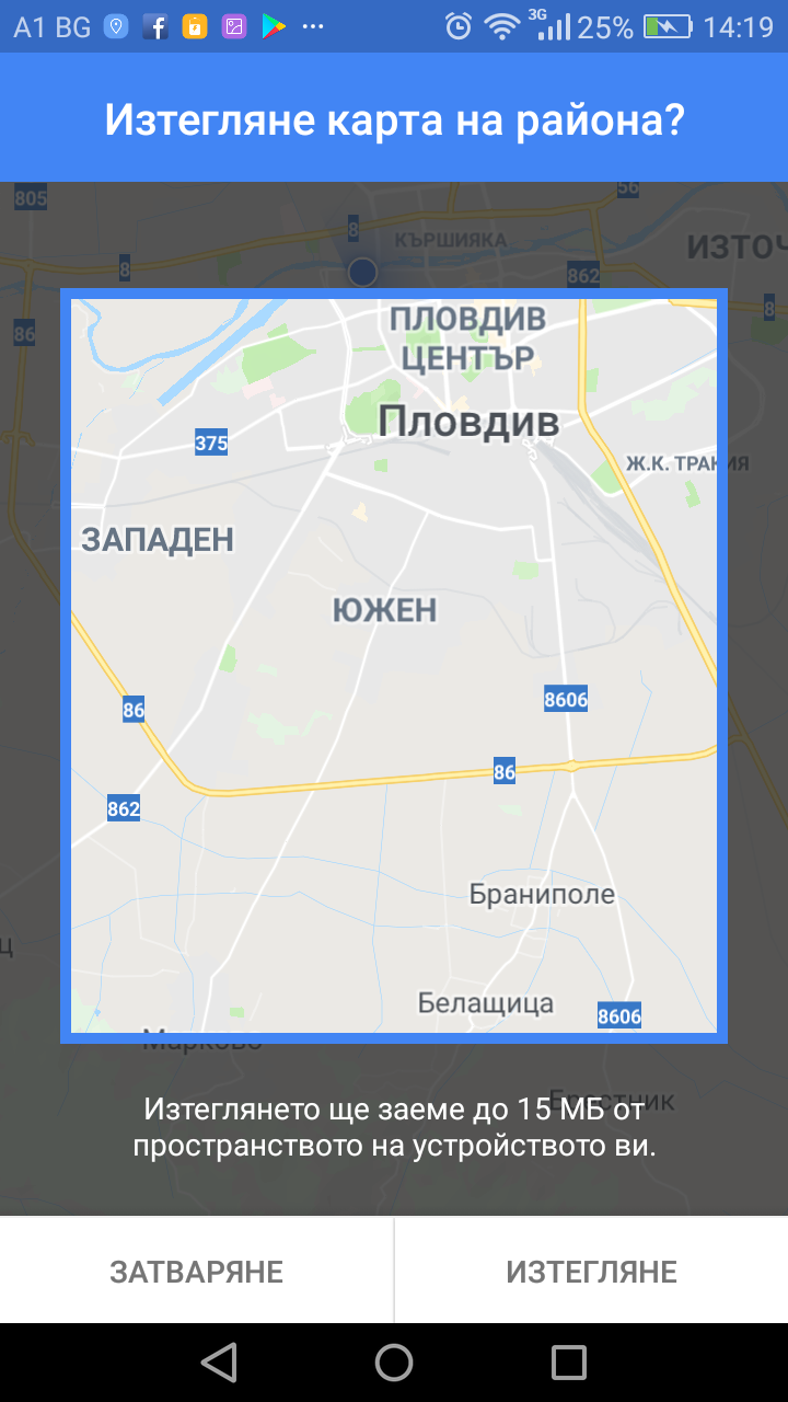 Тук трябва да изберете offline карти на желан от вас район, които да изтеглите. В този момент трябва да прецените две неща – карти на кой район са необходими, за да ги изтеглите, както и трябва да съобразите дали разполагате с налично място за съхранение на картите. Устройството ви трябва да има достатъчно памет за тях. Ако ви предстои дълго пътуване, можете да изтеглите необходимите райони отделно.