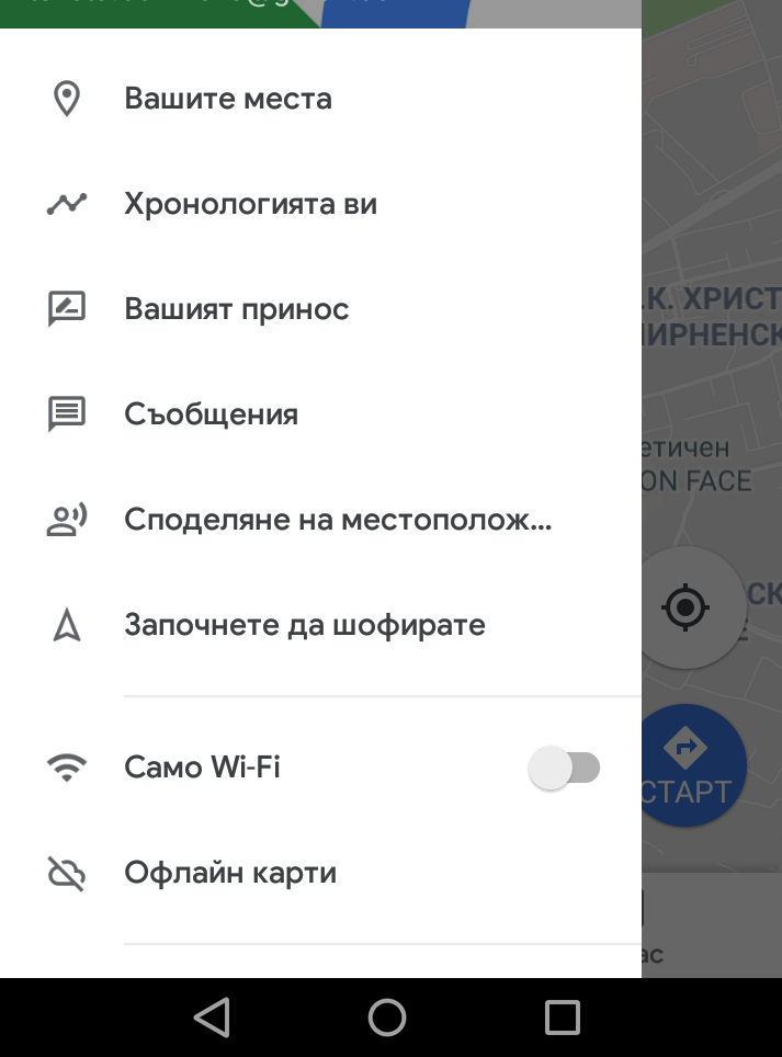 Щом настройката за език е направена, може да изберете режим на работа. Тук може да добавите любими места като адреса на дома ви, месторабота и да ги съхраните за бърз достъп, като така няма да се налага винаги да го въвеждате. В тази секция ще са достъпни още история на места, на които сте били, възможност за споделяне на местоположение с други хора (в онлайн режим, понеже ще се ползват приложения онлайн за контакт с останалите, като Viber, Messenger) и т.н. Има много важни настройки, на които трябва да обърнете внимание тук, ако приложението ще се използва без Интернет. Първо трябва да настроите приложението да ползва Интернет само чрез Wi-fi, като активирате опция „ Само Wi-fi”. Така вие избирате приложението да ползва Интернет, само когато е налице wi-fi връзка, но не и да използва мобилните данни от плана ви, които могат да бъдат таксувани.