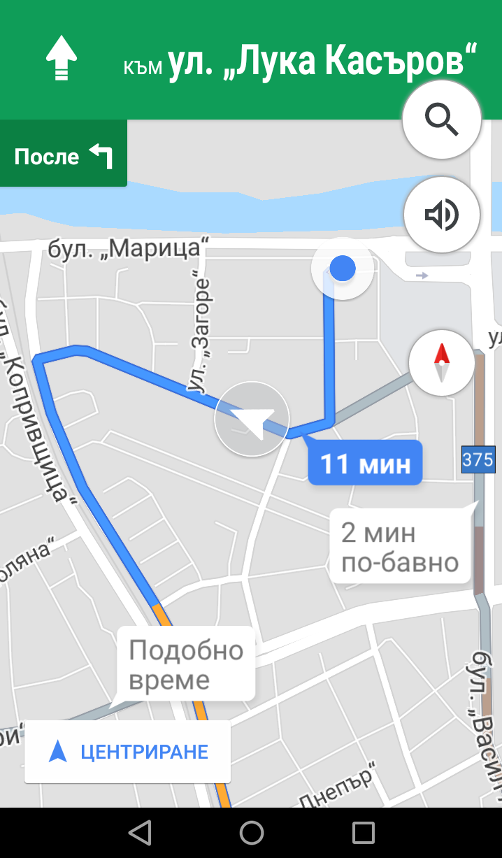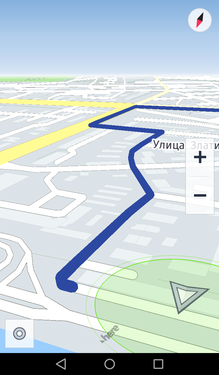 След като сте избрали маршрут и начин на пътуване ще имате възможност за преглед на картата. Ако сте съгласни с маршрута може да потеглите. Ще се визуализира стрелка, която показва къде на картата сте и в коя посока трябва да се движите. Маршрутът ще се отличава с цветна линия.