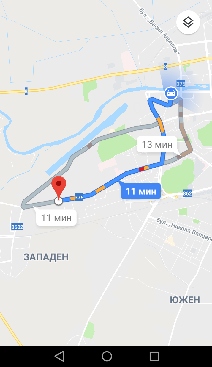 Изчисленият от приложението маршрут ще бъде показан на екрана, където може да увеличавате и намалявате мащаба на картата, за да го прегледате обстойно. С друг цвят са маркирани алтернативните маршрути. Може да изберете сред тях.