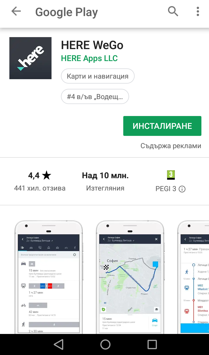 Нека прегледаме друга популярна безплатна навигация. Тя е известна към момента с името HEREWEGO. Можете да я изтеглите и инсталирате от магазина за приложения.
