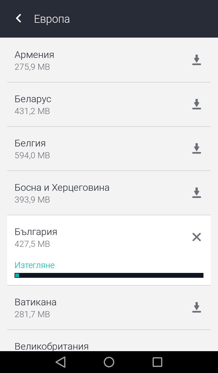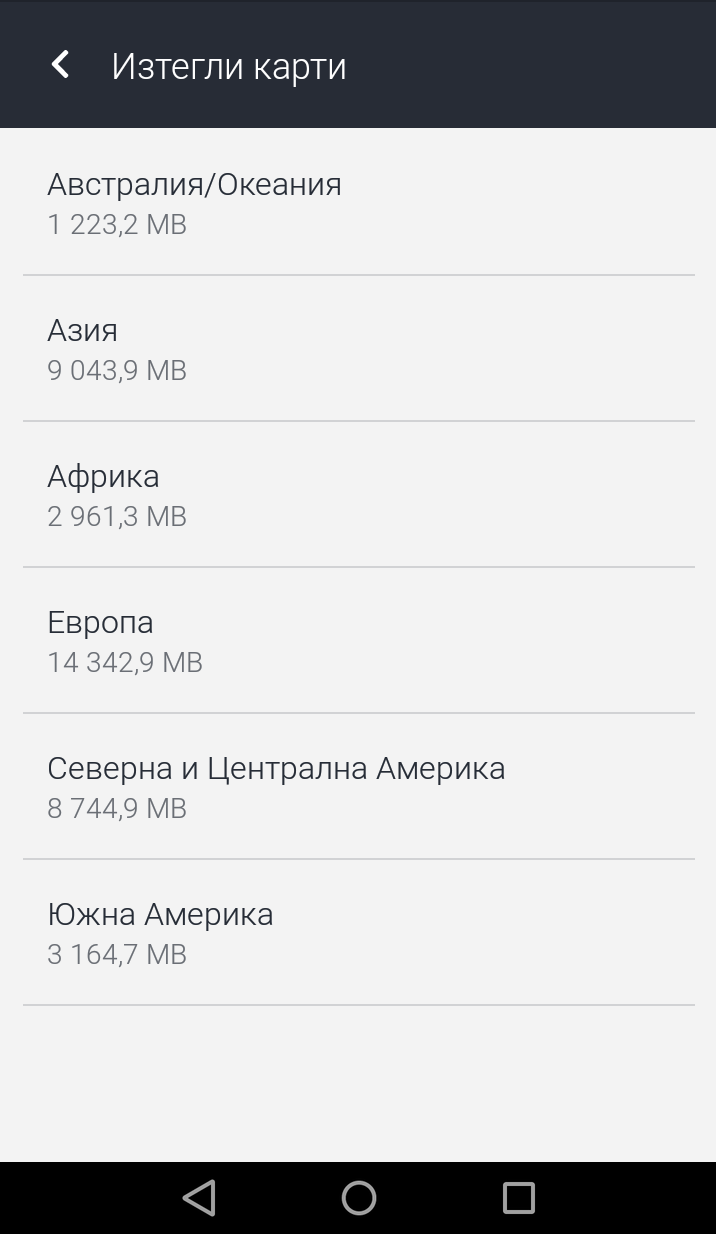 В това приложение ще ви бъдат изведени всички налични карти. Можете да изберете да изтеглите карти по континенти на отделни държави или на целия континент. Това, разбира се, е тясно свързано с наличната свободна памет на устройството ви.