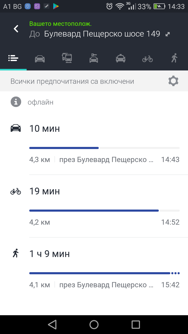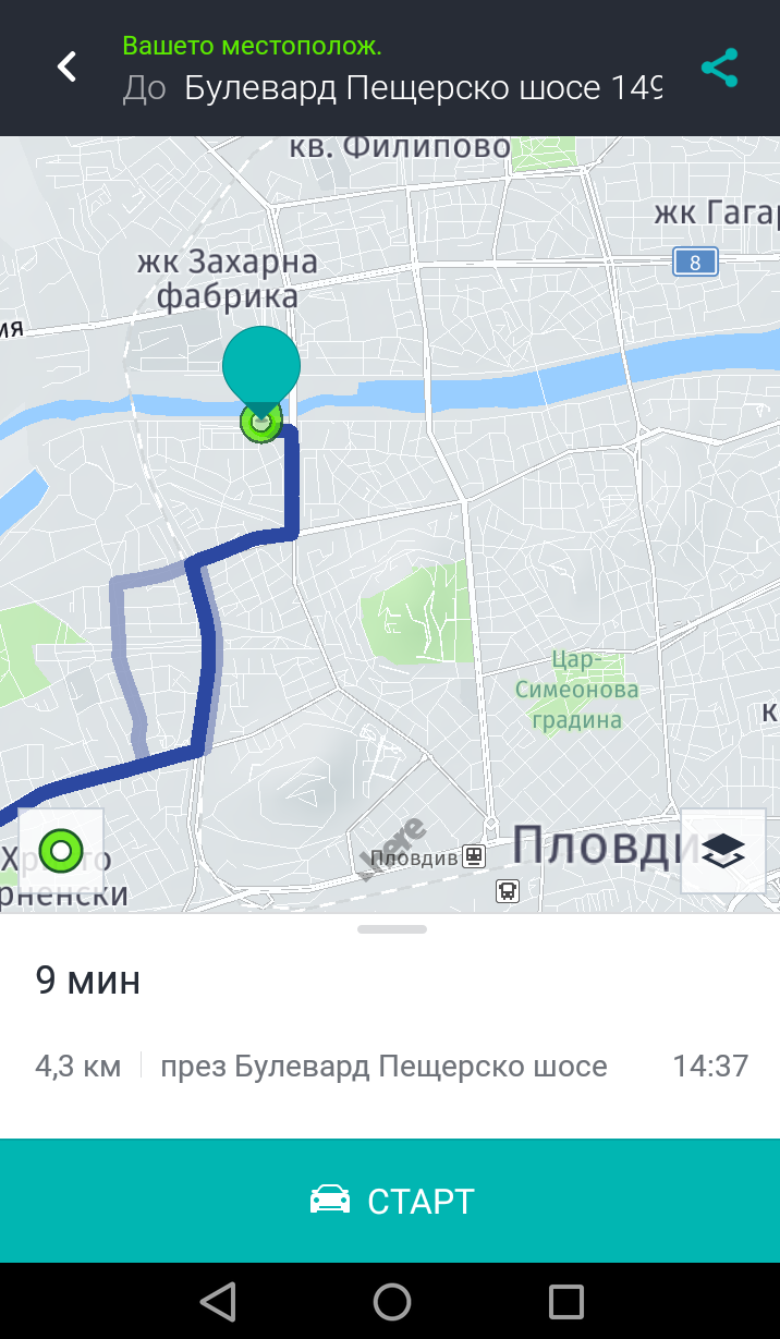 Ако не желаете да извършите промени по маршрута можете да го направите от „Опции на маршрута, където да въведете например междинна спирка – място, от където желаете да минете, преди да достигнете до крайната цел, да споделите маршрута с други и т.н. След като сте избрали маршрут, можете да потеглите. Вашата позиция и посока ще бъде отбелязана на картата със стрелка, а маршрута, по който трябва да се движите – с цветна линия.