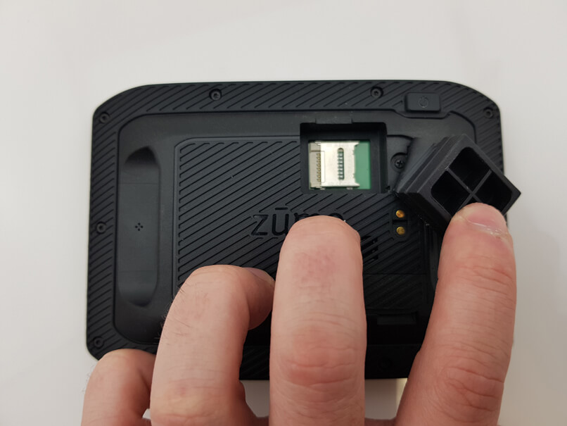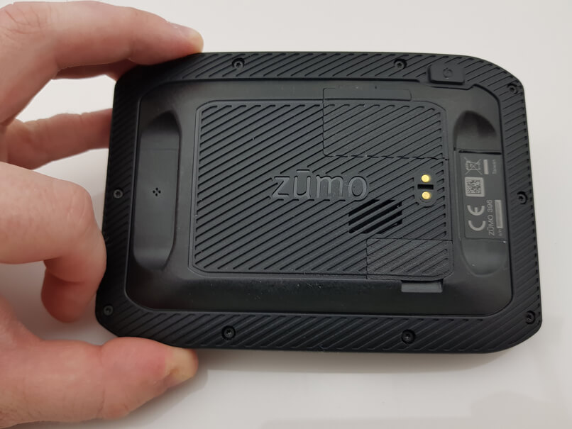Друга промяна е разположението на MicroSD картата. Вместо отдолу, сега тя е разположена директно на гърба. При новия модел трябва да повдигнете гуменото капаче и след това металния елемент, за да поставите microSD картата вътре и да я фиксирате на мястото й. Освен това zumo 396 LMT-S използва същaта захранвана поставка като 395 и 390 моделите.