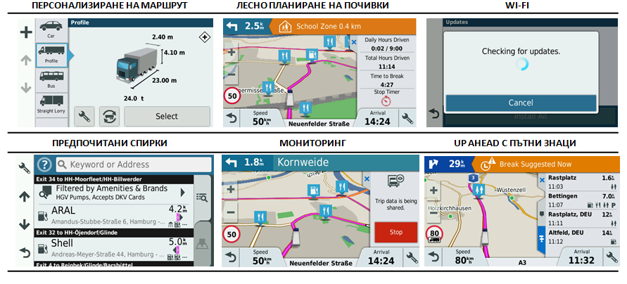 ЛЕСНО ПЛАНИРАНЕ НА ПОЧИВКИТЕ – ОТЧИТА ЧАСОВЕ НА КАРАНЕ И ЗАДЪЛЖИТЕЛНИТЕ ПОЧИВКИ И ВКЛЮЧВА НАВРЕМЕННИ ИЗВЕСТИЯ С POI ТОЧКИ, КОИТО ПРЕДПОЛАГАТ ПРЕДСТОЯШИ СПИРКИ НА КАМИОНИ, ПРЕТЕГЛЯЩИ СТАНЦИИ, МЕСТА ЗА ПОЧИВКА И ДРУГИ.