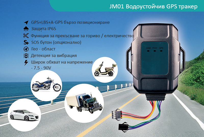 JM01 водоустройчив и прахоустойчив GPS тракер е мощен и лесен за използване, специално проектиран за мотоциклет, електромобил и подобни превозни средства. Работното напрежение е 7.5-90 VDC, което би било подходящо за всяко превозно средство на пътя. С GSM + GPRS + GPS технологията, устройството може лесно да се постигне бързо и точно позициониране. IP65 стандарта предпазва устройството от дъжд и прах. Функциите детекция за вибрация, бутон SOS, гео-област и дистанционно изключване на захранването предпазва напълно автомобила.