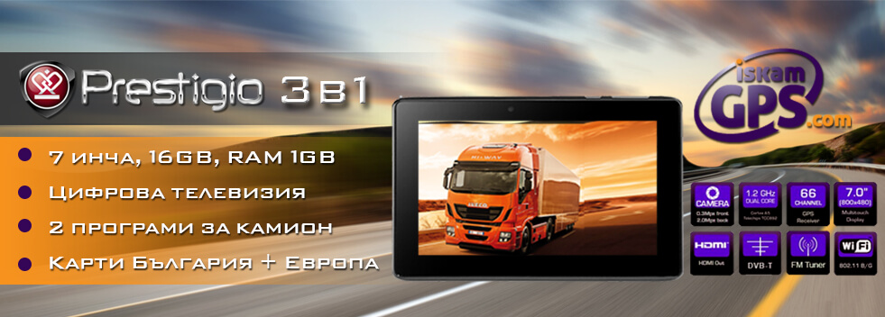 Изгодна оферта за международни шофьори - нов 7 инчов таблет с GPS навигация и цифрова телевизия от Prestigio! Висока резолюция на дисплея 800х480, бърз процесор 1.2GHz, 1GB RAM памет, 8GB твърд диск + 8GB карта памет БОНУС, последна версия на Android - 4.2, инсталирани 2 навигационни софтуера за камион с карти на България, Турция и цяла Европа. Тестван тунер за цифрова телевизия. DVR функция за видеозапис по време на шофиране. 2 години гаранционен срок.