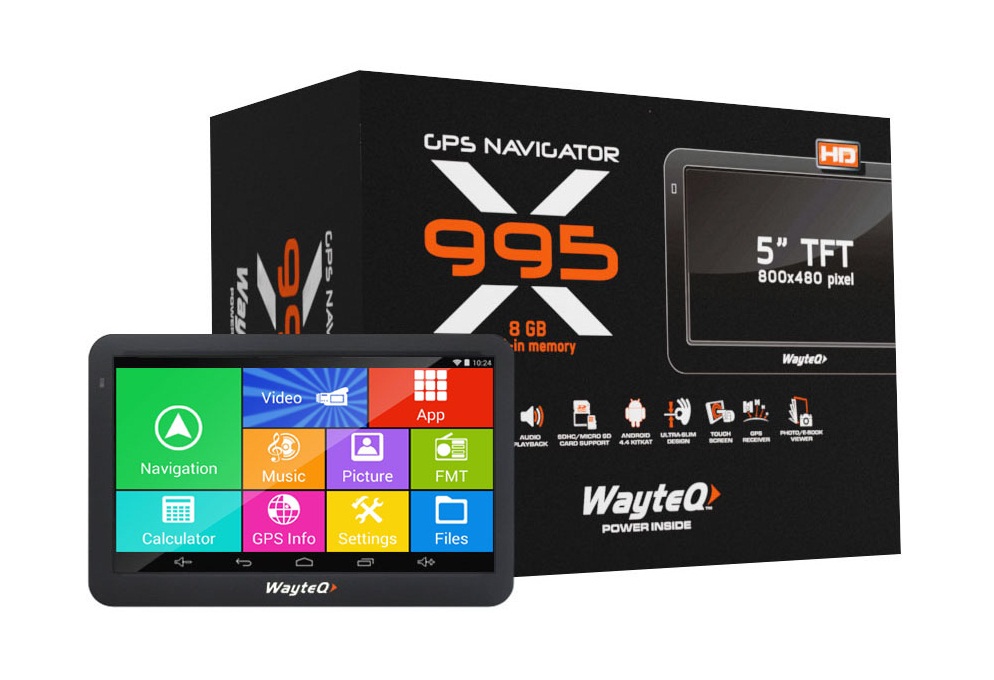 WayteQ x995 притежава дисплей с невероятна яркост, така че да можете да го използвате и при силна слънчева светлина. Устройството е снабдено с високо капацитетна батерия, която да гарантира по-дълго време на работа. GPS устройството има WiFi функция с уеб браузър и Android приложения. Bluetooth функцията може да прехвърли звука от устройството на слушалки или тонколони и също така дава възможност за обмен на файлове. Вграденият микрофон и говорител с висока производителност позволяват използването на гласовите инструкции и навигация. Вграденият FM трансмитер дава възможност да се прехвърли звука от устройството към безжичната автомобилна аудиосистема. Просто настройвате звука на колата на правилната честота, за да се насладите на любимата си музика, видео клипове или за да слушате упътването на навигационния софтуер през високоговорителите на автомобила.